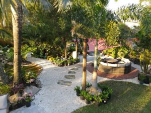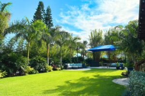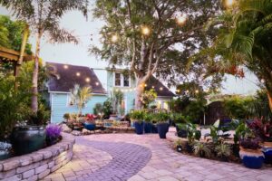 A beautifully paved courtyard featuring a custom tiki hut, outdoor bar and kitchen, and multiple seating areas. A festive atmosphere ideal for parties, receptions, or casual get-togethers.