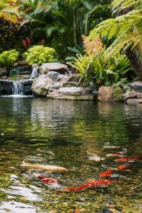 A serene setting with a koi pond, lush greenery, and vibrant blooms. Enjoy multiple seating vignettes, a shaded pergola, and the soothing sound of a nearby stream and waterfall. Perfect for intimate gatherings and relaxed celebrations.